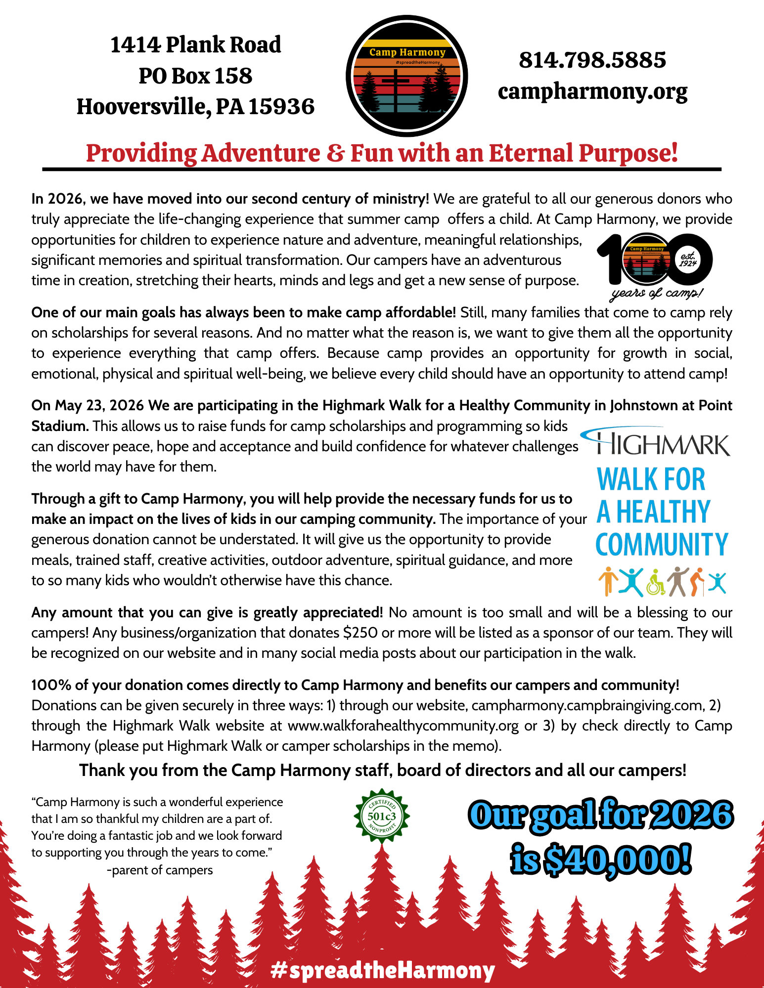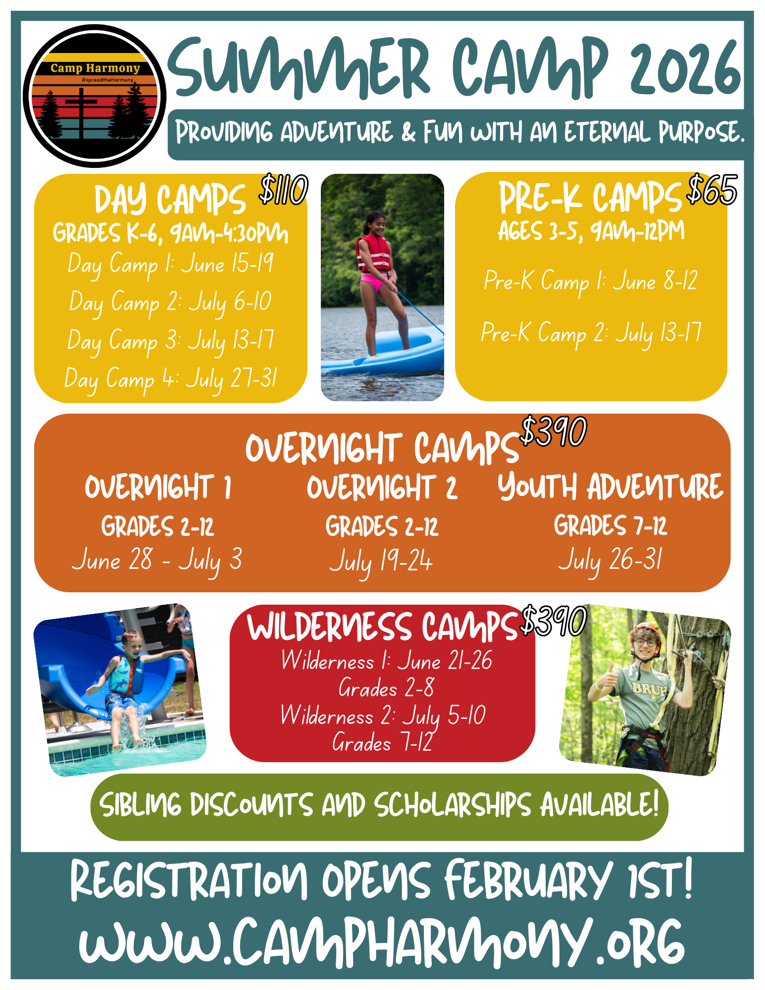 Youth Adventure Camp - Get ready for adventure! Campers and staff travel together to explore the North Carolina Mountains and stay at Camp Carmel, our sister camp located in Linville, NC. Highlights of this camp are mountain hiking, beautiful scenery and fellowship with campers from other Christian camps who join the adventure with us. There are spiritual growth opportunities such as mountaintop Bible studies, campfire worship, and evening reflections. Camp Harmony’s Operations Director leads this exciting experience. Grades 7-12, $390/camper (includes meals and lodging). The last day to register for Youth Adventure is .